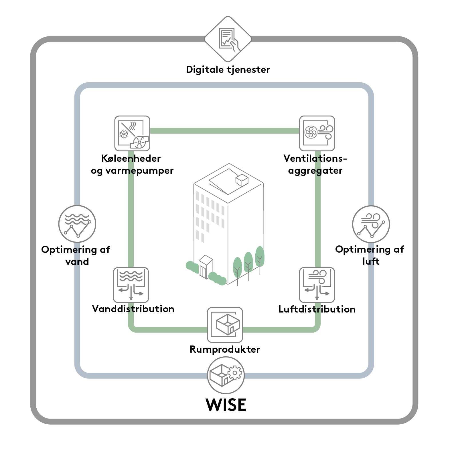 Med WISE er det som udgangspunkt muligt at styre alle elementer i et klimasystem, herunder ventilationsaggregater og klimaprodukter. Derudover kan WISE også styre optimering af vand og luft. Endvidere er det muligt at tilføje digitale tjenester, hvor produkters og egenskabers data kan visualiseres og administreres.