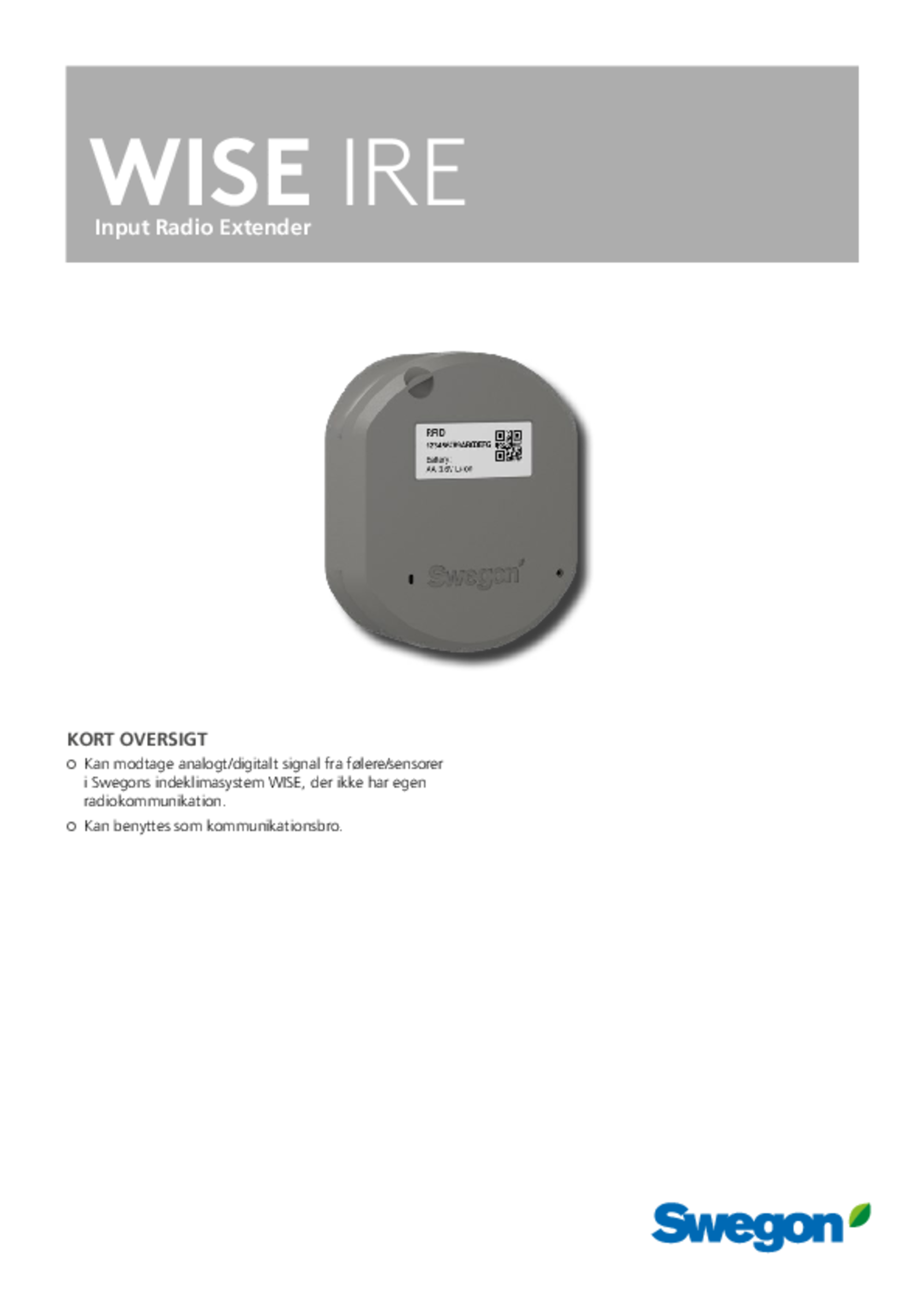 - Kan modtage analogt/digitalt signal fra følere/sensorer i Swegons indeklimasystem WISE, der ikke har egen radiokommunikation.