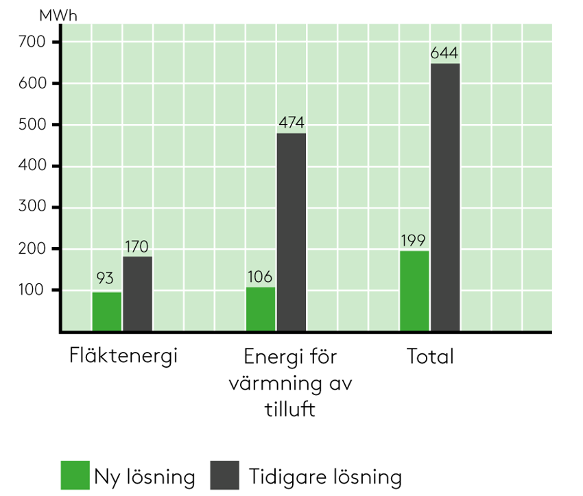 I efteråret 2022 blev der foretaget en måling, der viste en imponerende energibesparelse på 445 MWh om året, siden installationen blev udført. Denne besparelse kommer hovedsageligt fra varmegenvinding og reduceret behov for ventilatorenergi, men også fra en reduceret luftstrøm i de perioder, hvor klasseværelserne er tomme. Sidstnævnte opnås ved hjælp af Swegons WISE-system, læs mere i afsnittet om behovsstyret system.