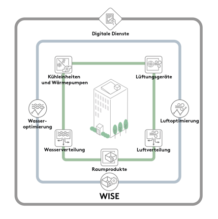 Bei Verwendung von WISE ist es im Grunde möglich, alle Bestandteile eines Klimasystems wie Lüftungsgeräte und Klimaprodukte zu steuern. Ergänzend kann WISE auch die Optimierung von Wasser und Luft steuern. Außerdem können digitale Dienste hinzugefügt werden, mit deren Hilfe Produkt- und Immobiliendaten visualisiert und verwaltet werden können.
