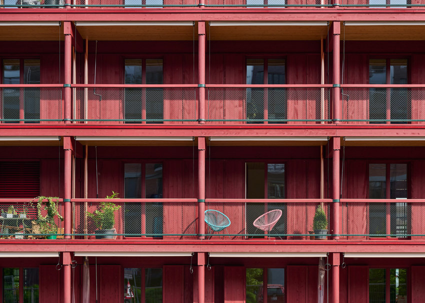 Die Laubengangerschliessung der Wohnungen begünstigt die sozialen Kontakte. Die Holzarchitektur bildet den ausdruckstarken, aber ruhigen Rahmen für ein dem Massstab angemessenes Wohnen. Raumhohe, einfach schöne, doppelflüglige Holzfenster lassen Licht und Wärme auf den Boden fluten, lassen aber auch den in diesem städtebaulichen Kontext notwendigen Rückzug zu. Topfpflanzen, Hängematten und Möbel beleben die Verandenarchitektur und verleihen der Gestalt Leichtigkeit, Wohnlichkeit und Behaglichkeit.