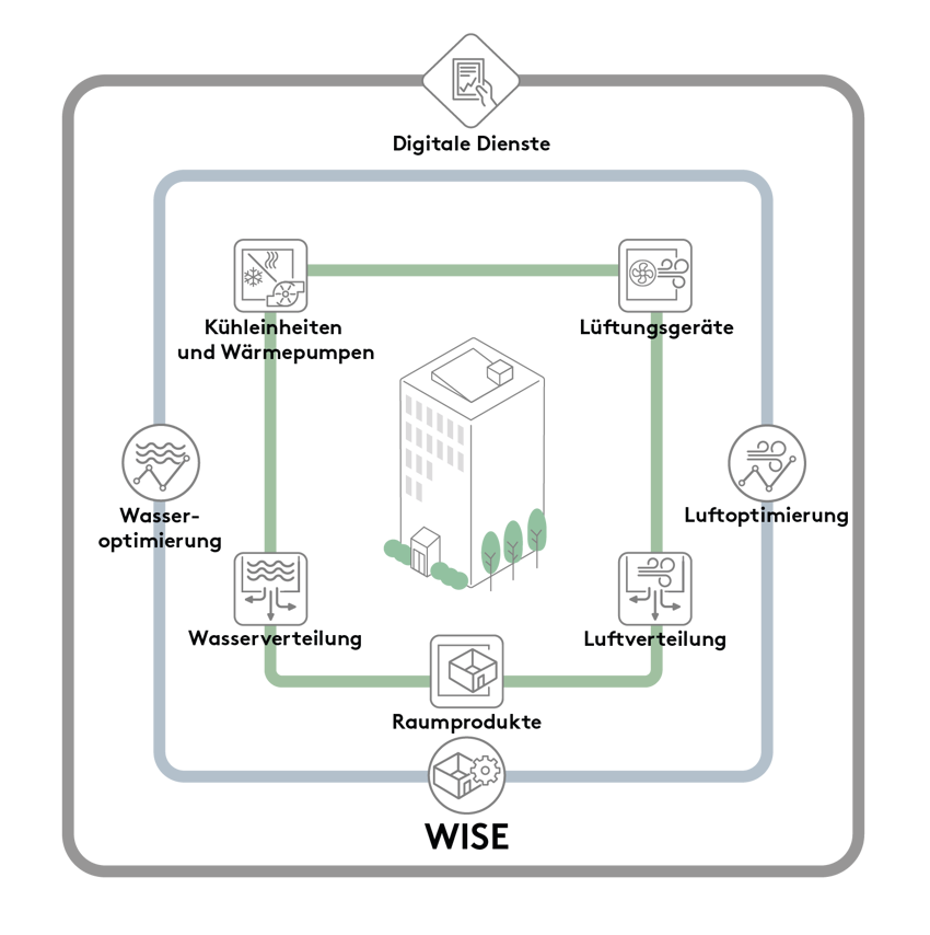 WISE arbeitet fast wie das Gehirn eines Klimasystems: Es sammelt Daten und optimiert das Raumklima entsprechend. Bei Verwendung von WISE ist es im Grunde möglich, alle Bestandteile eines Klimasystems wie Lüftungsgeräte und Klimaprodukte zu steuern. Ergänzend kann WISE auch die Optimierung von Wasser und Luft steuern. Außerdem können digitale Dienste hinzugefügt werden, mit deren Hilfe Produkt- und Immobiliendaten visualisiert und verwaltet werden können.