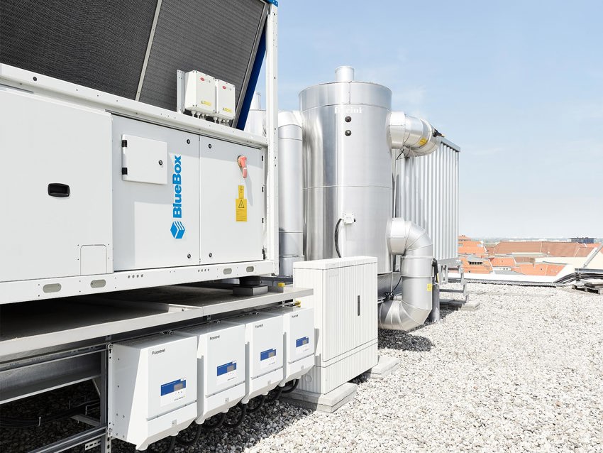 Sind Gebäude so gelegen, dass sie in den Übergangszeiten einerseits intensiver Sonneneinstrahlung und starker Beschattung ausgesetzt sind, muss die Gebäudetechnik Besonderes leisten. Der sonnenbeschienene Teil des Gebäudes will gekühlt werden, die verschattete Teil verlangt nach Wärme. Dafür war ein Konzept zur Wärmeverschiebung naheliegend.