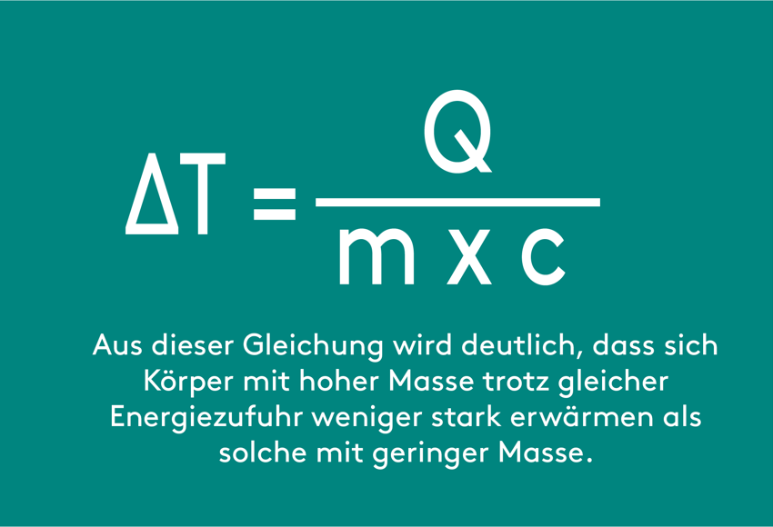 Alle Körper haben eine bestimmte thermische Trägheit oder Wärmekapazität. Neben dem Wärmekoeffizienten* (c) eines jeden Stoffes oder Stoffgemisches setzt sich der Grad der Umwandlung von Energie (Q) in Wärme (T) auch aus der Masse (m) eines Körpers zusammen. Aus der Gleichung wird deutlich, dass sich Körper mit hoher Masse trotz gleicher Energiezufuhr weniger stark erwärmen als solche mit geringer Masse.