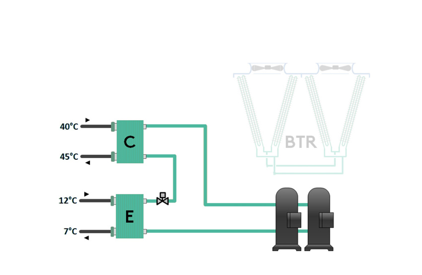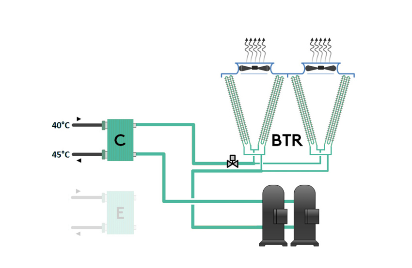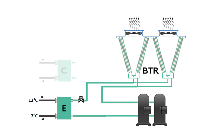Die Einheiten arbeiten in der Betriebsart „Kühlen“, wenn das System nur die Erzeugung von Kaltwasser anfordert. Sie verwenden die Register „BTR“ als Wärmetauscher-Quellenseite und erzeugen gekühltes Wasser am Wärmetauscher „E“. Hier wird der Kaltwasserkreislauf zur Gebäudeklimatisierung angeschlossen.