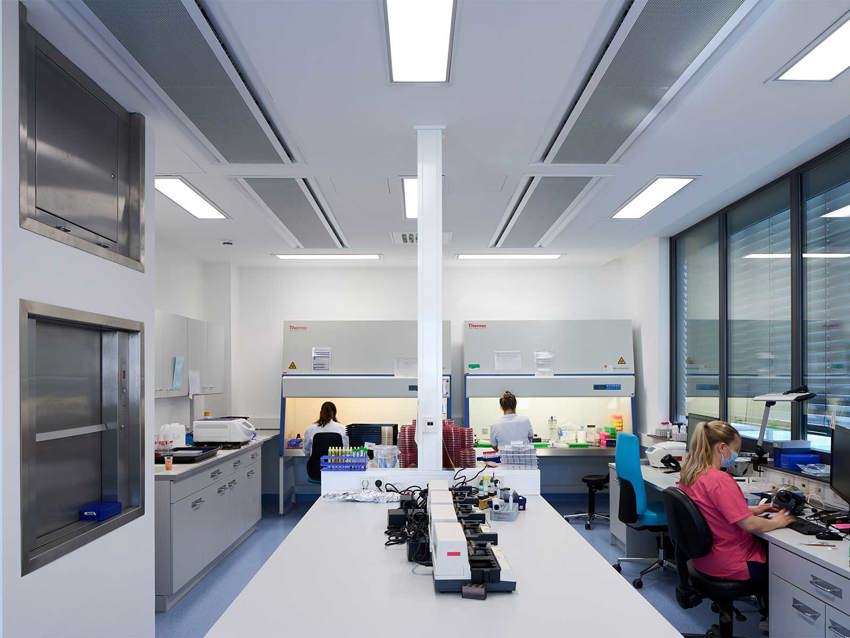 Der Neubau des alphaomega Labors in Leipzig verlangte nach einer besonders hygienischen und komfortablen Klimalösung. Schließlich ist ein Arbeitsschwerpunkt des Labors Hygienediagnostik, zum Beispiel bei Trinkwasserinstallationen. Das Kompaktlüftungsgerät GOLD RX mit Rotationswärmetauscher liefert besonders hygienisch frische Luft, denn eine Spülkammer und die sogenannte Carry-over-Control verhindert eine Vermischung von Zu- und Abluft. Es wurden zwei Geräte auf den Dächern der beiden Gebäude installiert. Hohen Komfort erreicht die Anlage durch zugluftfreie und leise Innenraumgeräte und eine bedarfsgerechte Steuerung der Volumenströme.