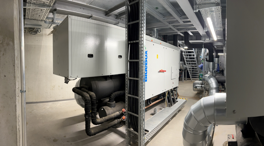 Während der Kühl- und Heizperiode fallen in einem der beiden Neubauten Abwärme an. Um diese sinnvoll ein zu setzen und nicht ungenutzt über das Grundwasser abzuführen, wurden in der Anlagentechnik Energieverschiebungen eingeplant, um eine möglichst energieeffiziente und nachhaltige Energiebereitstellung zu realisieren. Die Besonderheit dieses Areals ist die Hybridmaschine, welche für die Energieverschiebung, sowohl für die Kühlung als auch Heizung eingesetzt. Die übrige Abwärme wird in einen Warmspeicher geleitet und die Kälte in einen Kaltspeicher. So kann die jeweilige Energie zur Beheizung und Kühlung des Gebäudes verwendet werden.