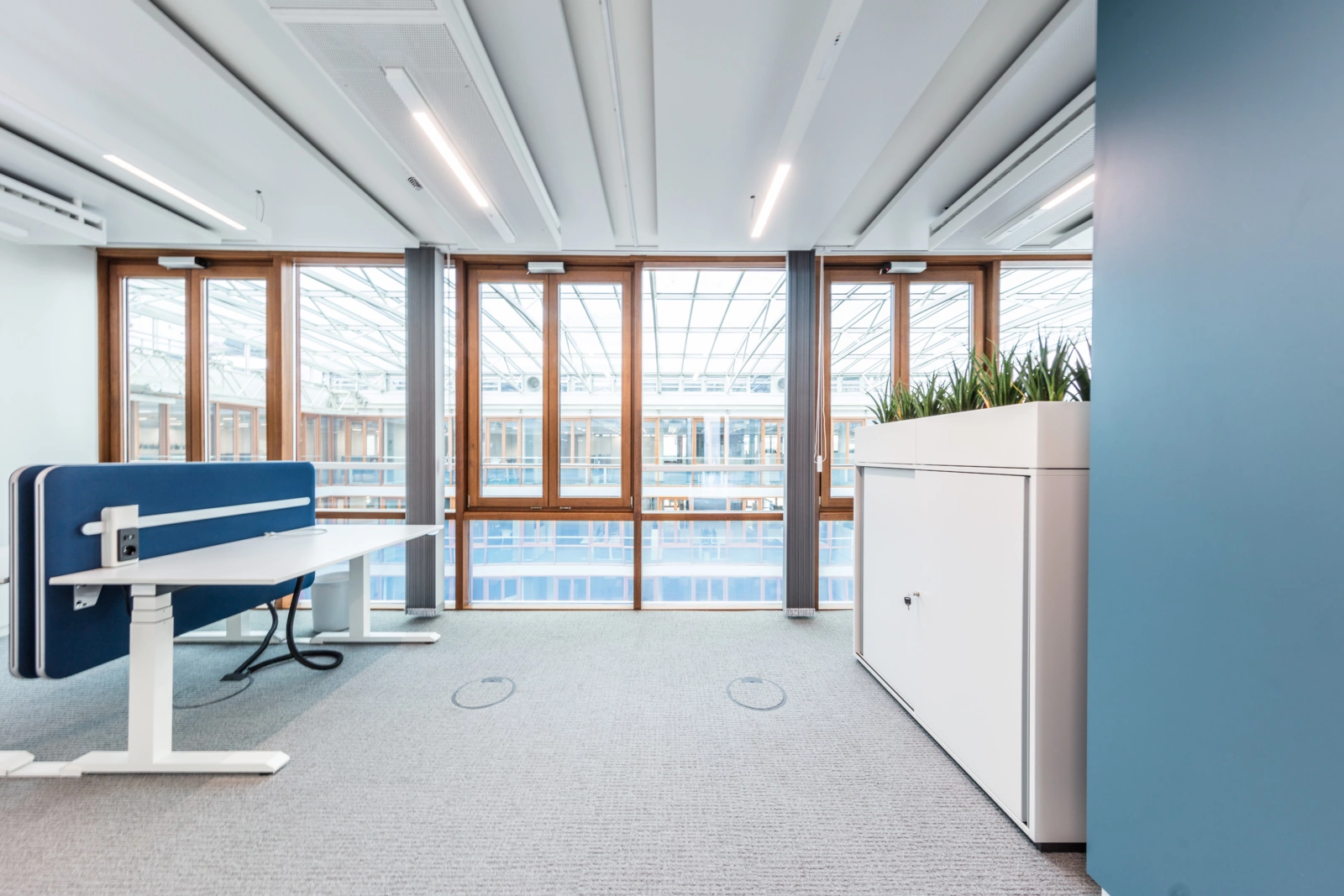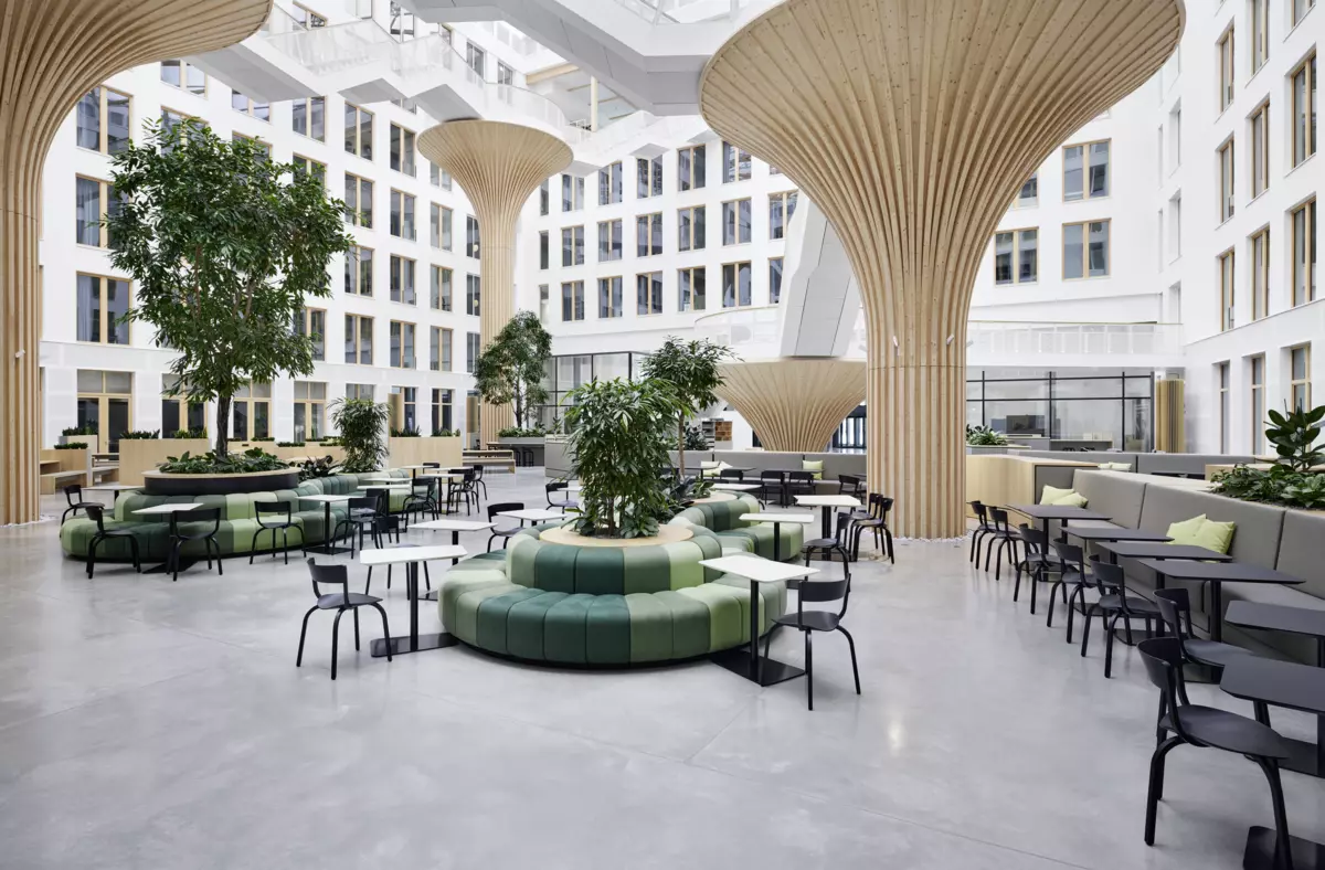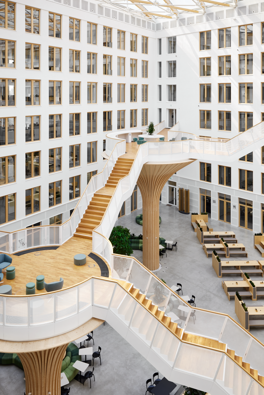 Die Atriumhalle wurde mit speziell angefertigten Verdrängungslüftungssäulen ausgestattet. Diese SLT-Speziallösung bestand aus Verdrängungslüftungsgeräten im unteren Bereich sowie aus Strahldüsen im oberen Bereich der Säule. Die Belüftungselemente wurden mit einer Holzkonstruktion verkleidet und so in das Thema Nachhaltigkeit integriert. Dieses Produkt gewährleistet die Frischluftzufuhr im Nah- und Fernbereich des Diffusors und sorgt so für eine vollständige Versorgung des Wohnbereichs mit Frischluft.