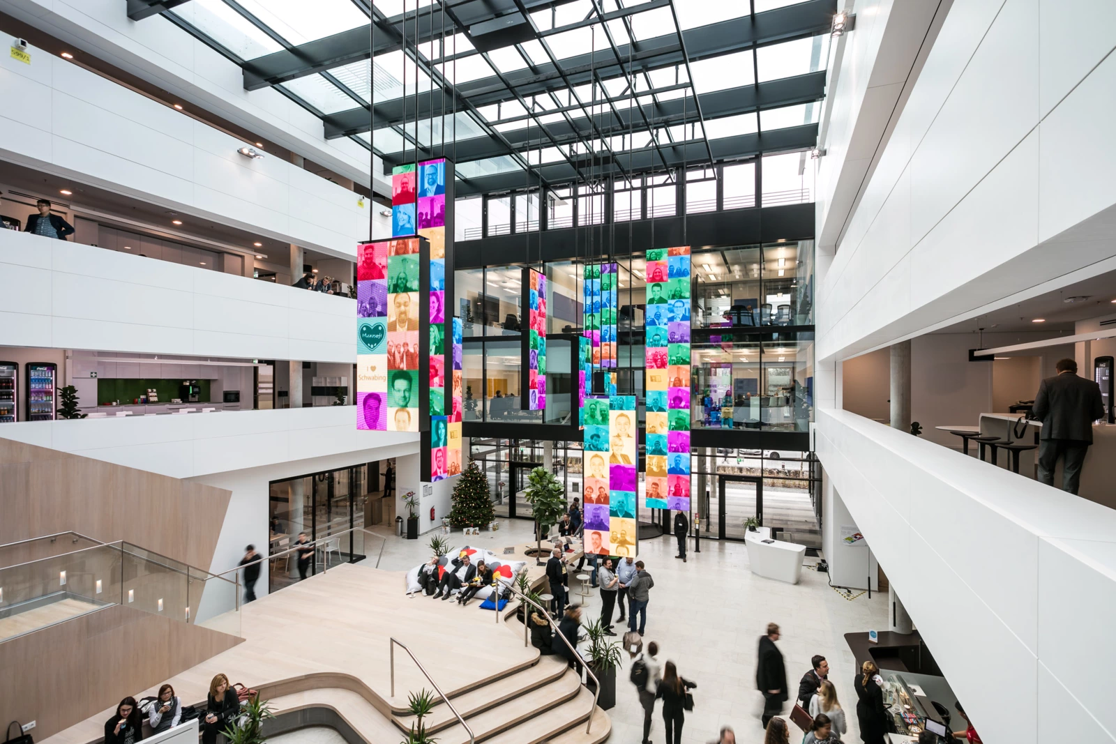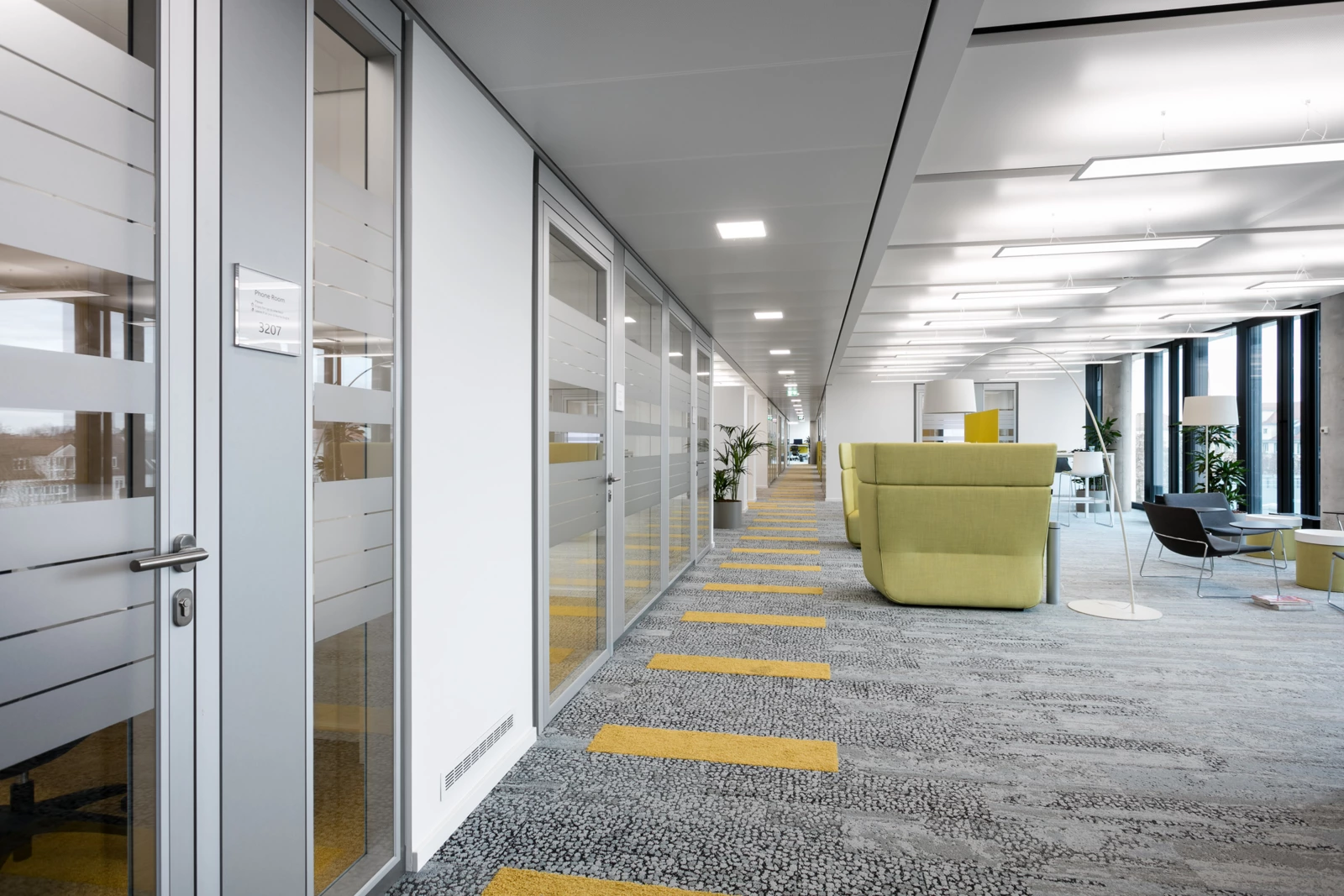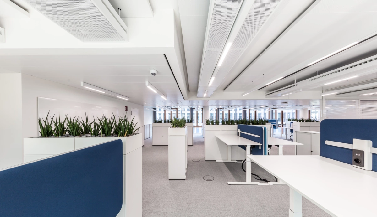 SSLT hat ein einzigartiges Design für Deckeninduktionsgeräte entwickelt und die DIAF und DIA-HF in großen Stückzahlen für die Sanierung eines Bürogebäudes in der Neuen Mainzer Straße in Frankfurt angepasst, um mehrere Stockwerke mit insgesamt ca. 8.000 m² Bürofläche zu klimatisieren. Die neu entwickelten Geräte setzen sich aus einer Reihe von Abschnitten mit einer Gesamtlänge von bis zu 3.900 mm. Neben der Induktionsfunktion des Produkts sind LED-Leuchten und schallabsorbierende Segelflächen integriert.​​