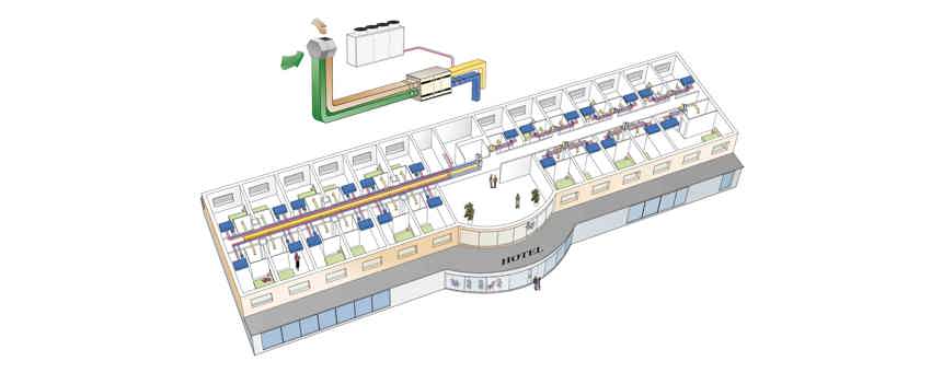 Systemlösungen für die bedarfsgesteuerte Lüftung von Hotels müssen auf einem ganzheitlichen Ansatz basieren und alle erforderlichen Bauteile enthalten. Zur Veranschaulichung kann man von der Systemlösung für ein Hotel mit fünf gleichermaßen aufgebauten Etagen ausgehen. Hier teilt man die Anlage in zwei Teilanlagen auf, die als Kombination große Einsparmöglichkeiten im Vergleich zu herkömmlichen Hotellösungen bieten.