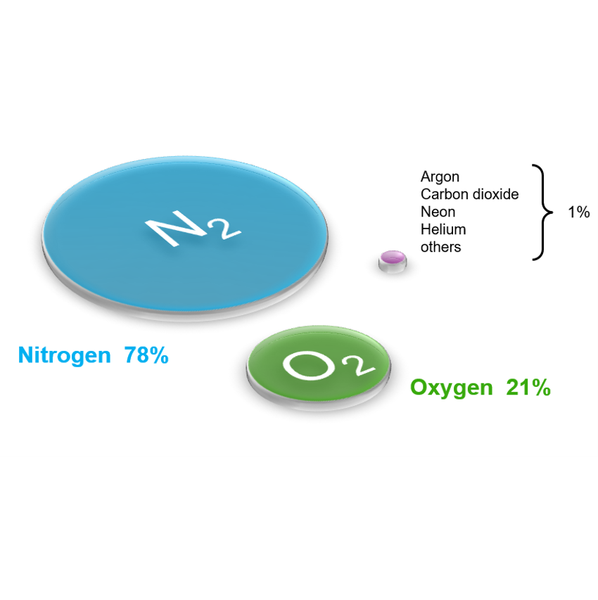 El aire seco está formado por una mezcla de gases. El 78% es nitrógeno, el 21% es oxígeno y el 1% restante está formado por gases como el dióxido de carbono, el argón, el neón, el helio, etc. El aire seco se mezcla con una cantidad de vapor de agua de hasta un 4% aproximadamente.