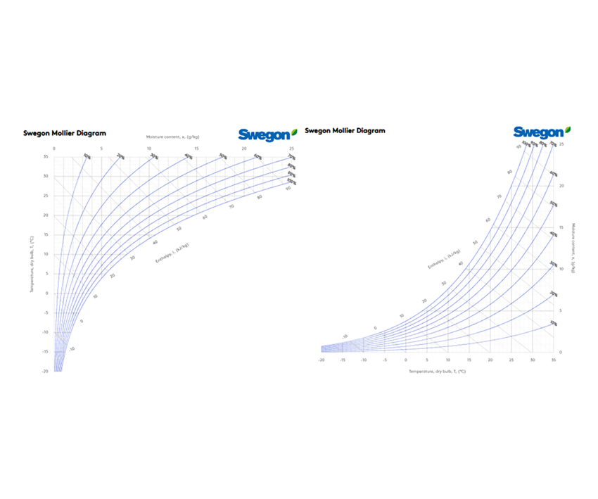 El diagrama de la izquierda es el diagrama de Mollier que se utiliza en muchos países. El diagrama de la derecha suele llamarse diagrama psicrométrico y se utiliza en la mayoría de los países de habla inglesa. Los diagramas son realmente los mismos - dan los mismos resultados pero las escalas de temperatura y humedad específica están invertidas.