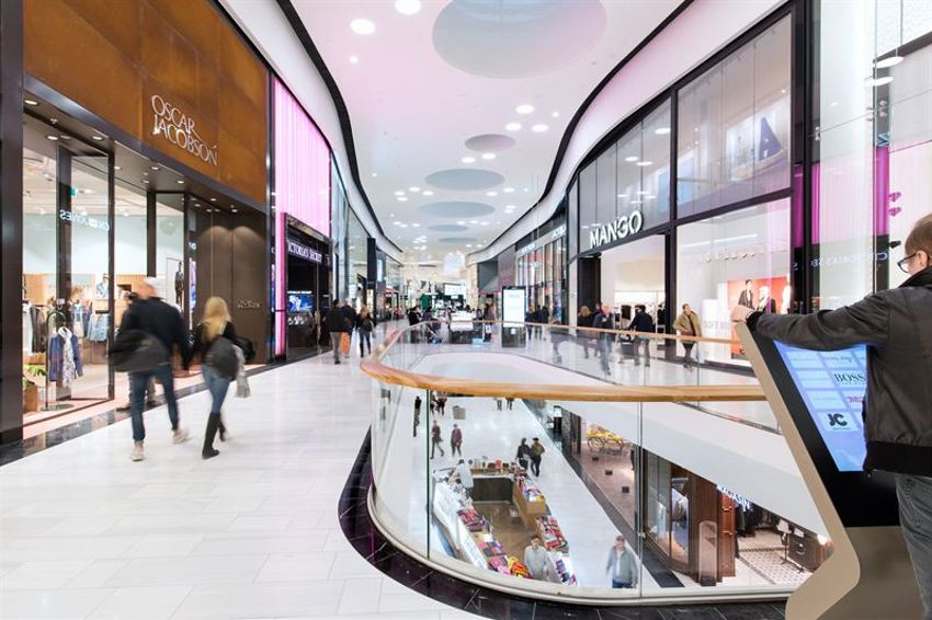 Hay un total de 224 tiendas y restaurantes, repartidos en 100.000 m2 entre los que por supuesto se encuentra una tienda de la marca Mango donde se han instalado difusores Swan de Swegon.