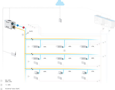 SuperWISE calcula y adapta continuamente la temperatura del aire de impulsión Lee las necesidades de calefacción y refrigeración de la estancia y reduce la necesidad de calefacción/refrigeración local en las estancias.