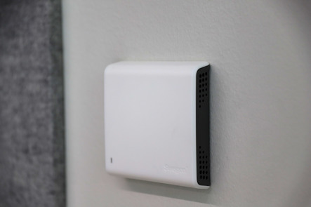 Sisäilman olosuhteita kokonaisjärjestelmää varten aistiva WISE IAQ -anturi koulun seinässä.