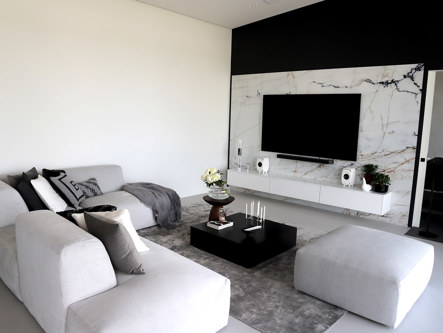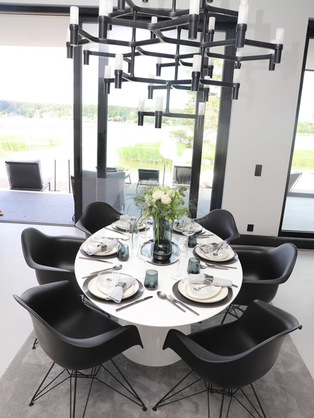 Mustaa väriä käytetään edelleen sisustuksessa runsaasti, niin myös Villa Havetin olohuoneessa.