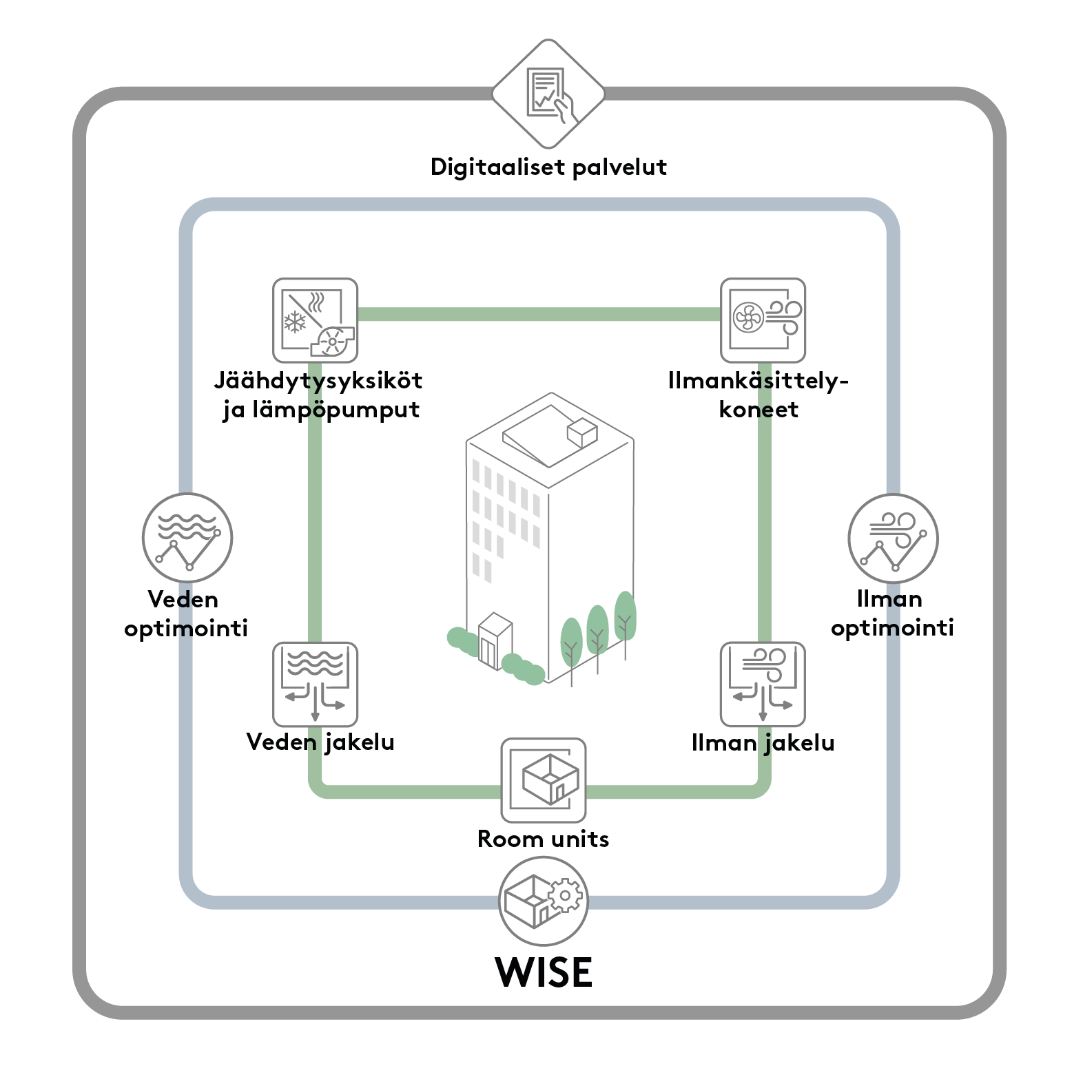WISE toimii sisäilmaston aivona, joka kerää tietoa kiinteistöstä ja optimoi sisäilmaston sen mukaisesti. Tiedot voivat sisältää kaikkea lämpötilasta ja ilmanlaadusta aina tilojen käyttöasteeseen. Käytämme tästä nimitystä tarveohjattu sisäilmasto.