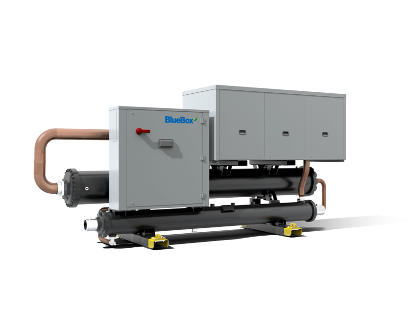 Refroidisseur de liquide à condensation par eau et pompe à chaleur, avec compresseurs à vis inverte et échangeur de chaleur multitubulaire.