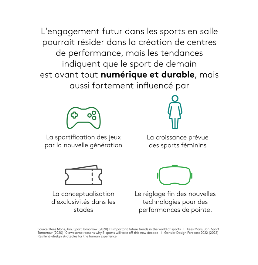 Sources : Abraham, Jonalyn. Gensler (2021) Designing performance centers to promote well-being for athletes I Internicola, Dorene. Reuters (2013) Les adeptes de l'exercice en plein air peuvent récolter des avantages inattendus en se déplaçant à l'intérieur.