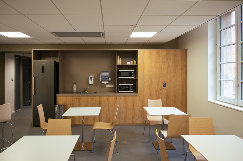 Inscrit aux monuments historiques, les caractéristiques principales du bâtiment ont bien entendu été conservées, à savoir les façades en brique de parement et la charpente. La restructuration d’une partie des bâtiments, a porté sur les éléments suivants :
