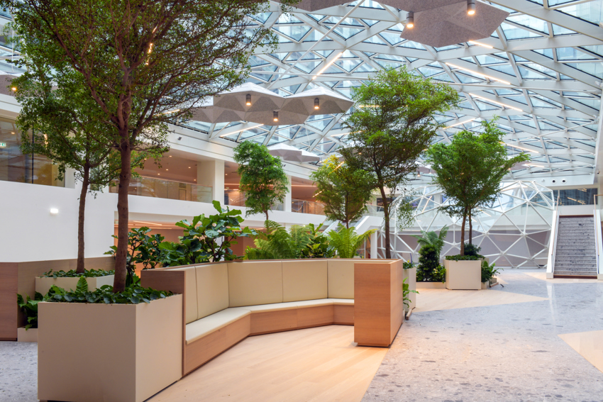 En réponse à la réalité actuelle du travail tertiaire de plus en plus nomades, l’immeuble possède des plateaux traversants et flexibles et de nombreux lieux favorisant les échanges. Les espaces se décloisonnent, sont modulables et divisibles à souhait. Ils s’ouvrent sur une grande place appelée Living Square, accueillant commerces et différents services (conciergerie, salle de fitness, salles de réunion réservables, commerces éphémères). On y trouve une halle gourmande de plus de 4000 m2 remplaçant le traditionnel