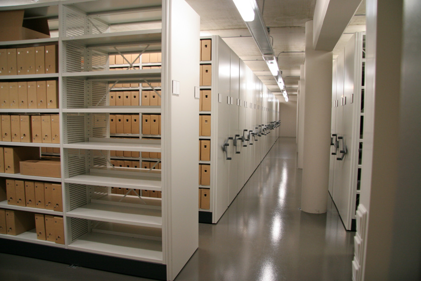 - Les magasins d'archives, vastes pièces équipées d'étagères où sont entreposés les documents de petit format (jusqu'au format A4).​