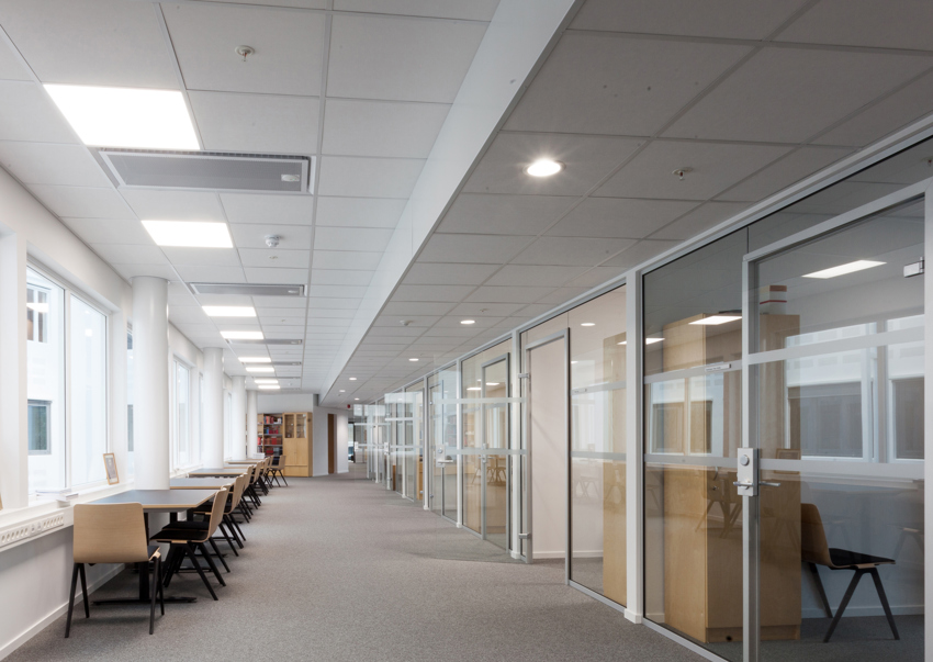 Il est également essentiel d'assurer une bonne performance énergétique et un climat intérieur optimal dans les bâtiments plus anciens. Associé à 8 centrales de traitement d’air GOLD, WISE garantit une qualité d'air de premier ordre. La ventilation, le chauffage et le refroidissement sont régulés en fonction de l'occupation, de la température et de la qualité de l’air. La température idéale est maintenue grâce à un système mixte de chauffage et de refroidissement, par air et par eau, distribué via les modules de confort, les registres et les diffuseurs d'air de Swegon. Dans les zones du bâtiment nécessitant un refroidissement accru, des ventilo-convecteurs sont également intégrés au système pour répondre à ces besoins spécifiques.