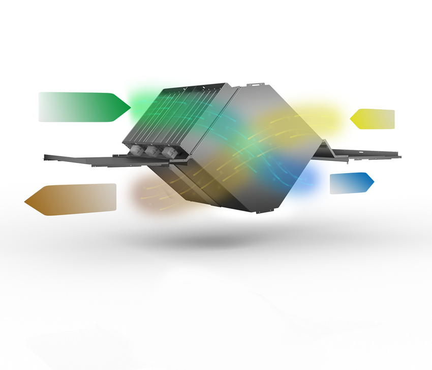 A counterflow plate heat exchanger consists of thin aluminium fins - plates - that form air ducts where the extract air counterflows the supply air for the best temperature efficiency. The warmer extract air heats the plates which transfers the heat to the colder supply air. The supply air and extract air flow in completely separate ducts, meaning that any odours or particles in the extract air are normally not transferred to the supply air.