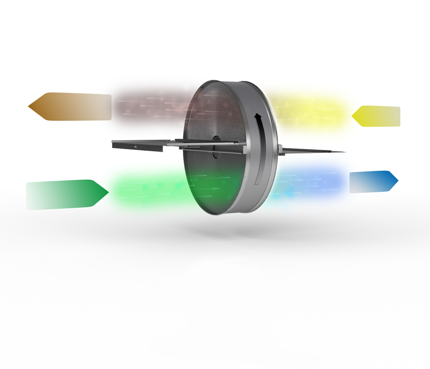 A rotary heat exchanger consists of a rotating wheel with a multitude of small ducts made of aluminium. The warm extract air heats the ducts which transfers heat to the colder supply air. The temperature efficiency of balanced supply and exhaust air is high. Normally, frost never forms inside a rotary heat exchanger. This allows high annual energy efficiency to be achieved.