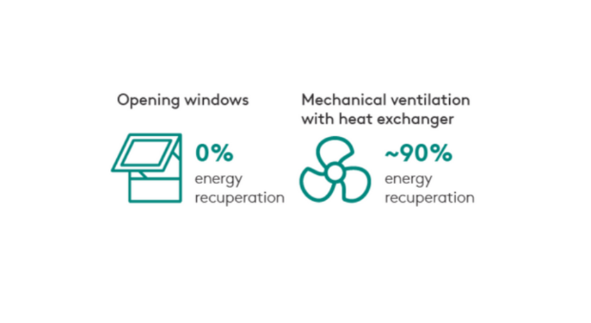 By making use of these building occupancy trends we ‘open the doors’ to excellent energy savings potential. For example, installation of mechanical ventilation with a heat exchanger could recuperate around 90% of the heating/cooling energy that would otherwise be lost in the exhaust air. By also choosing the right systems solutions for the mechanical ventilation, further savings can be made.