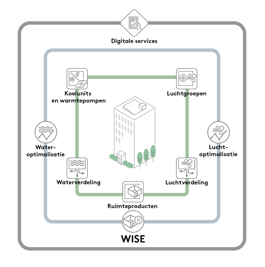 WISE kan gezien worden als het brein van het klimaatsysteem dat data verzamelt en het binnenklimaat op basis daarvan optimaliseert. Met WISE is het mogelijk om alle elementen in een klimaatsysteem te regelen, zoals luchtgroepen en klimaatproducten. Maar WISE is ook geschikt voor optimale regeling van water en lucht. Bovendien is het mogelijk digitale services toe te voegen om data over producten en gebouwen te visualiseren en beheren.