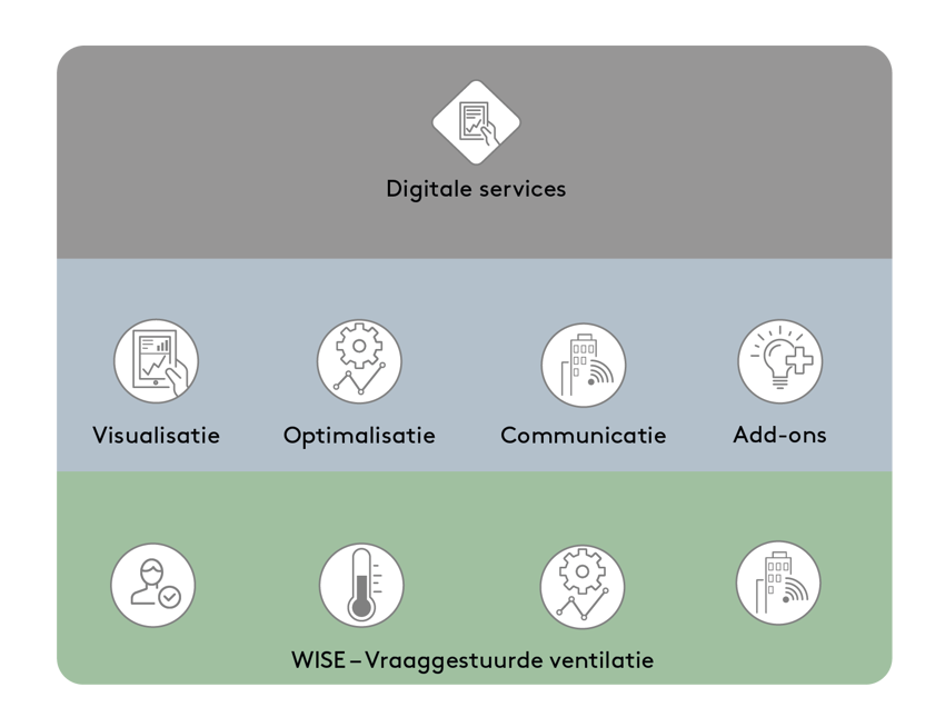 WISE bevat altijd een basispakket voor het bereiken van een vraaggestuurd binnenklimaat. Naast het basispakket kunnen er een aantal oplossingen worden toegevoegd, zoals visualisatie, optimalisatie, communicatie en verschillende functies. En dan is het ook nog mogelijk om een aantal digitale services toe te voegen, zoals:​