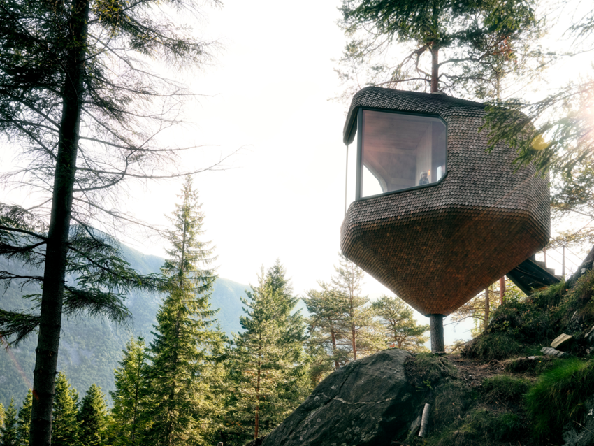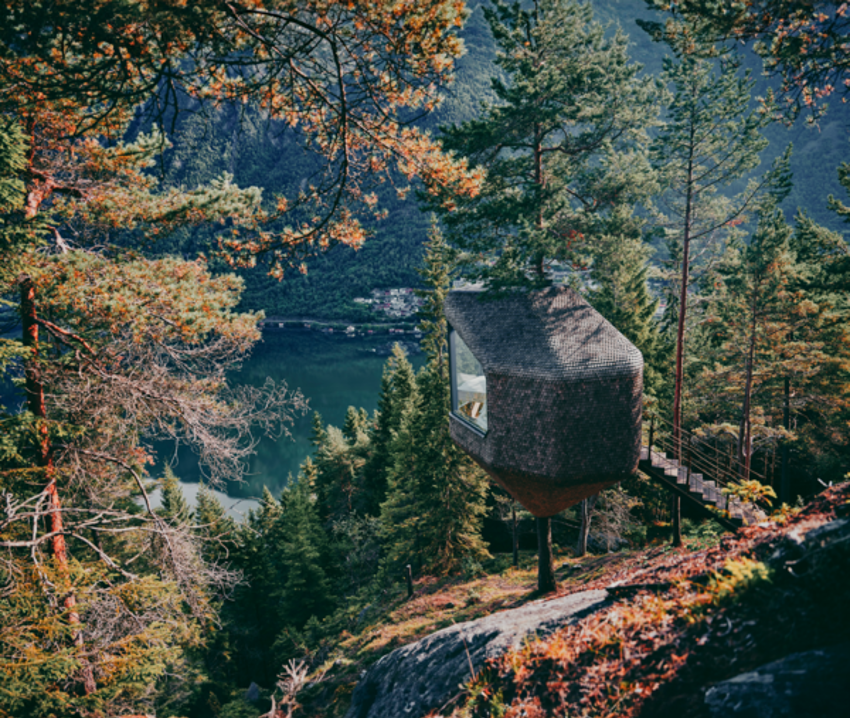 Disse luksuriøse trehyttene er ikke bare pent bygget i tre, men de er også unikt plassert i toppene av høye furutrær, som stiger langs fjellveggene som rammer inn Hardangerfjorden i Norge. Dette byggeprosjektet kan ikke lenger beskrives som helt unikt, men det er definitivt annerledes enn andre hotell man kan tenke seg.