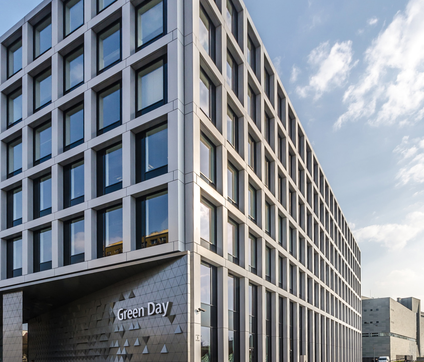 Green Day to nowoczesny biurowiec klasy A, którego charakterystycznym elementem jest aluminiowa mozaika przy wejÅ›ciu oraz jasnoszara elewacja, którÄ… przecinajÄ… równomiernie rozmieszczone okna.