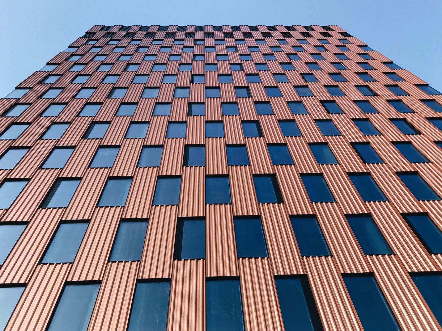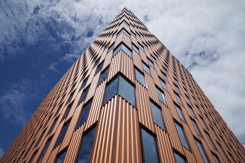 Budynek biurowy posiada elewacjÄ™ wykonanÄ… z elementów moduÅ‚owych o pionowych podziaÅ‚ach w kolorystyce bursztynu.