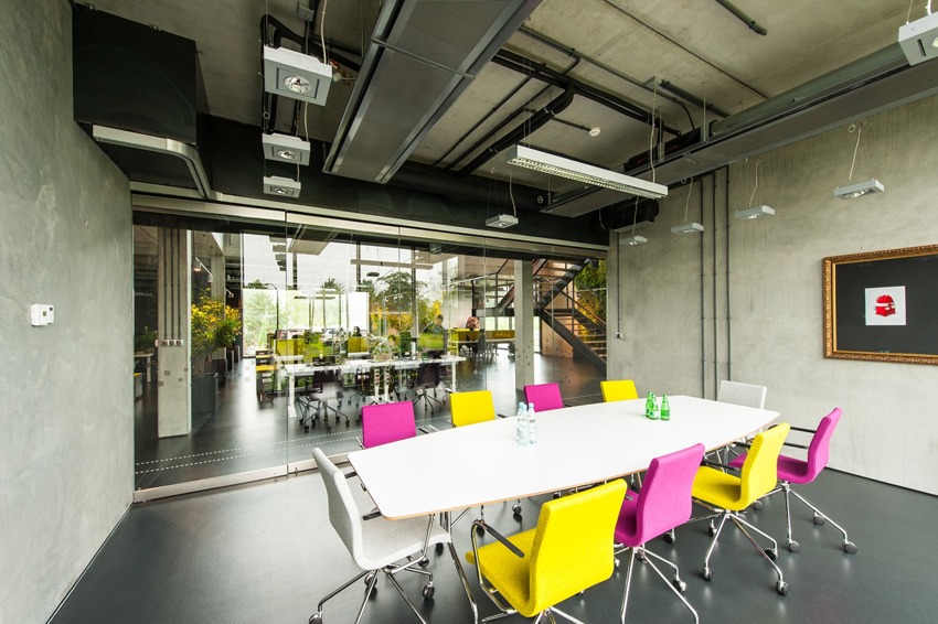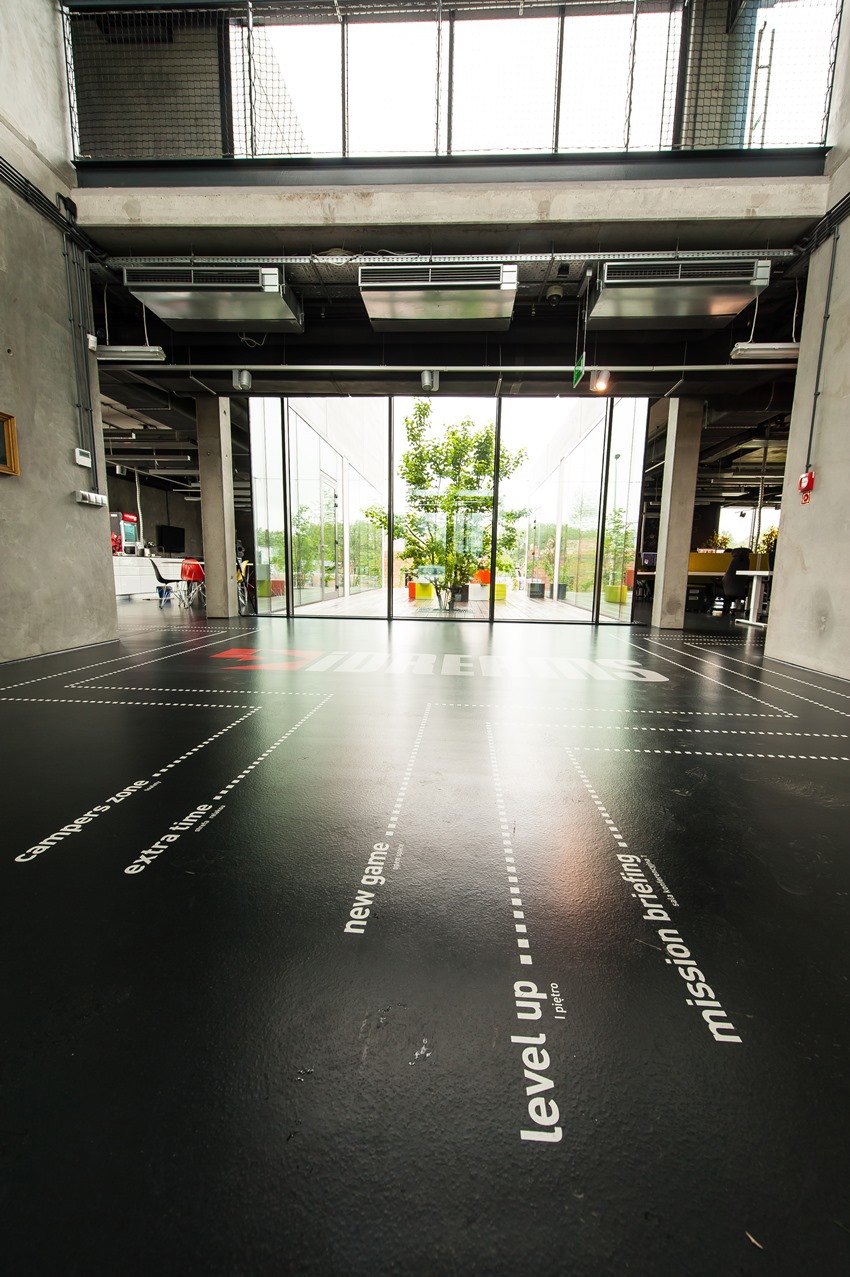 Biurowiec zarówno z zewnÄ…trz jaki i z wewnÄ…trz może sprawiać wrażenie nieukoÅ„czonego, co pasuje jednak do charakteru pracy nowoczesnej firmy programistycznej – pobudza kreatywność, tworzenie i ulepszanie nowych produktów.