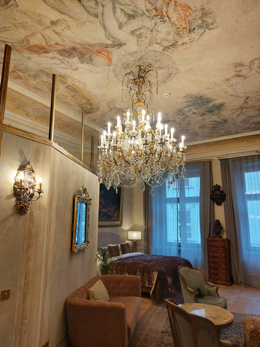 Pokoje oraz przestrzenie publiczne wykonane zostały z połączenia istniejących i odresturowanych elementów z nowymi materiałami, w których dominuje kamień, stal, mosiądz i szkło. Łazienki wykończone są różnorodnymi marmurami wysokiej jakości.