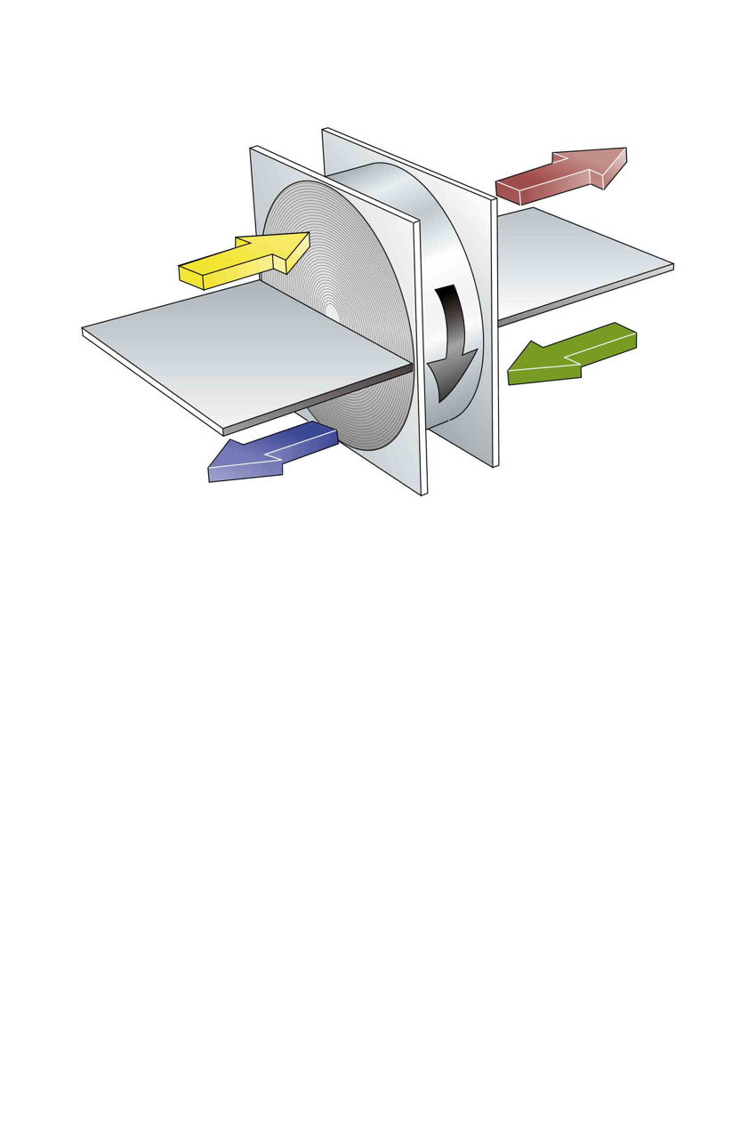 Rotacyjny wymiennik ciepÅ‚a skÅ‚ada siÄ™ z koÅ‚a obrotowego wykonanego z aluminium montowanego w sekcji. Jedna poÅ‚owa sekcji pracuje w strudze powietrza nawiewanego, a druga w strudze powietrza wywiewanego. StrukturÄ™ wymiennika tworzy wiele aluminiowych kanalików, umieszczonych równolegle do przepÅ‚ywu powietrza. W trakcie pracy centrali wymiennik wprawiany jest w ruch obrotowy. Cieplejsze powietrze wywiewane podgrzewa aluminiowe kanaliki i przenosi ciepÅ‚o do chÅ‚odniejszego powietrza nawiewanego. ChÅ‚odniejsze powietrze nawiewane przepÅ‚ywajÄ…c przez ciepÅ‚e kanaliki aluminiowe ogrzewa siÄ™.