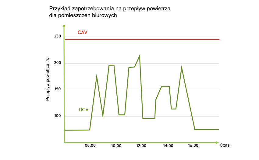 Powód dostosowania przepÅ‚ywu powietrza jest prosty. Ilość powietrza, którÄ… należy dostarczyć do pomieszczenia jest różna w zależnoÅ›ci od rzeczywistej liczby przebywajÄ…cych tam osób. W CAV przepÅ‚yw powietrza jest staÅ‚y i czÄ™sto ustawiony na maksymalnÄ… potrzebnÄ… wydajność. OczywiÅ›cie oznacza to, że dostarczana jest taka sama ilość powietrza, nawet jeÅ›li pomieszczenie jest caÅ‚kowicie puste. RozwiÄ…zaniem tego problemu jest wentylacja ze zmiennÄ… iloÅ›ciÄ… powietrza, sterowana aktualnym zapotrzebowaniem. VAV i DCV to dwa rodzaje systemów kontrolowanych na żądanie, które pomagajÄ… oszczÄ™dzać energiÄ™.