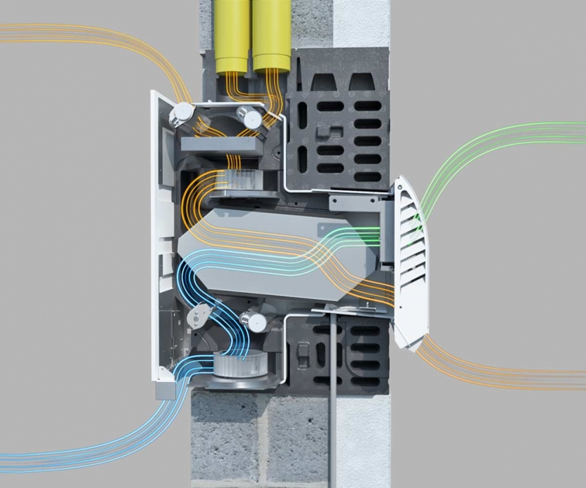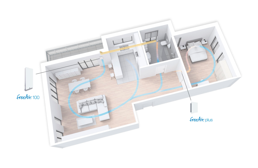 The freeAir plus transfer unit connects other rooms to the domestic ventilation system without any ducts. The sensors in the intermediate wall fan compare the air quality in adjacent rooms and activate the redirection of fresh air on demand.
