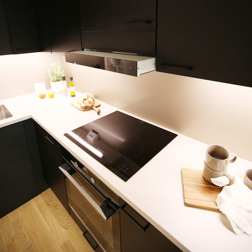 Both Salsa and Rock feature touch controls and LED lighting, and they are easy to clean. The key differene between the two is their installation: Salsa is a pull-out solution integrated into the kitchen cabinets and Rock is an island hood designed for open kitchen spaces.
