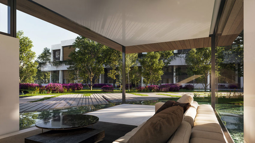 The ability to provide heat and cold at the same time is key as all villas may have different requirements throughout the day and year. When the interior garden, pictured in the image, is in the bright sun, cooling is most definitely needed. However, when the day passes by, other homes get in the sun, and heating might be necessary for this indoor environment to still be a comfortable living area.