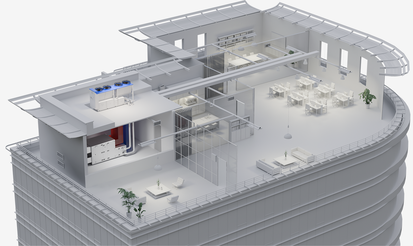 Complete system solution with ventilation, cooling, heating and energy optimisation.