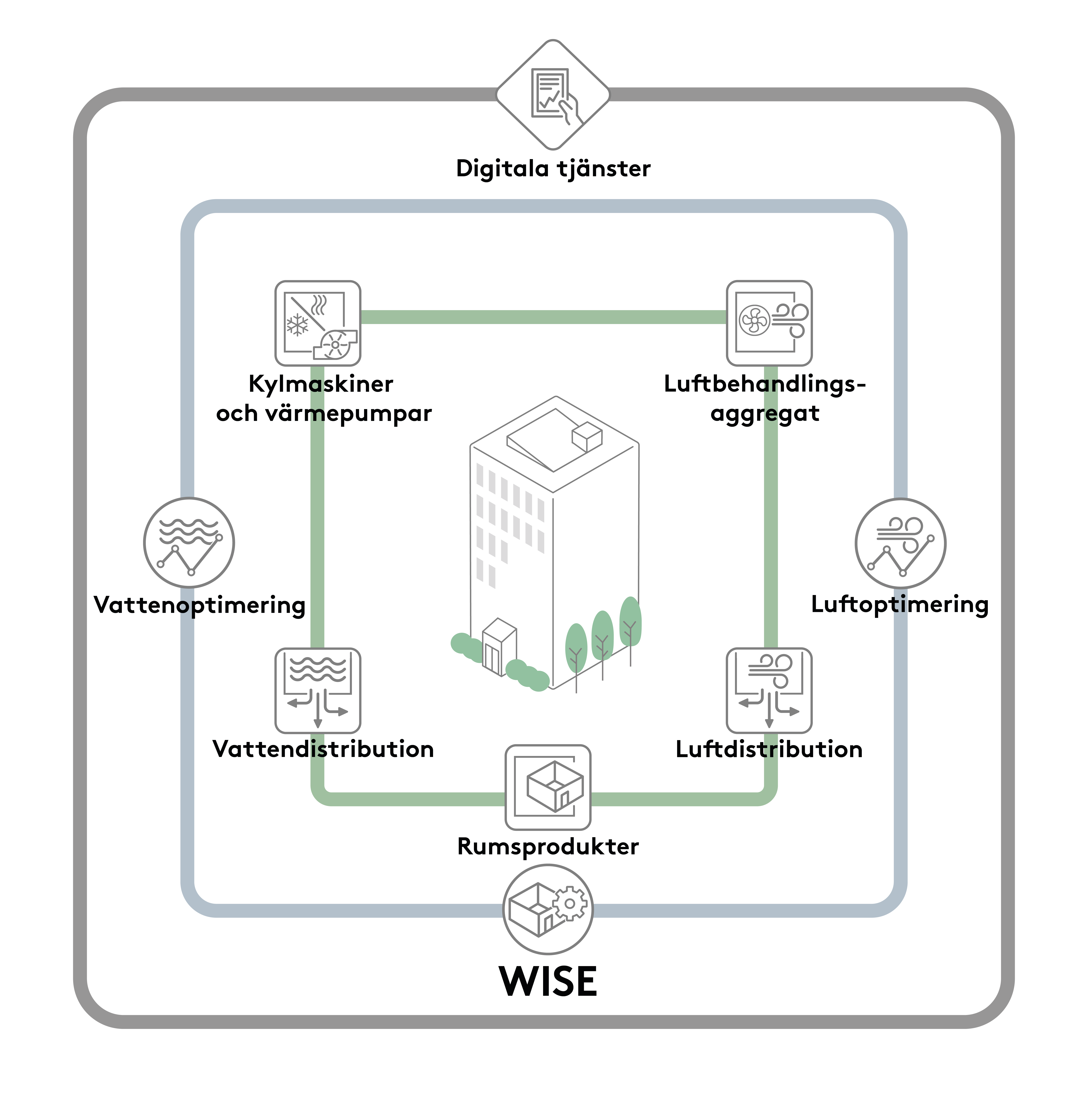 Med WISE är det i princip möjligt att styra all delar i ett klimatsystem, så som luftbehandlingsaggregat och klimatprodukter samt att WISE även kan styra vatten- och luftoptimering. Det finns dessutom möjlighet att lägga till digitala tjänster där produkters och fastigheters data kan visualiseras och hanteras.