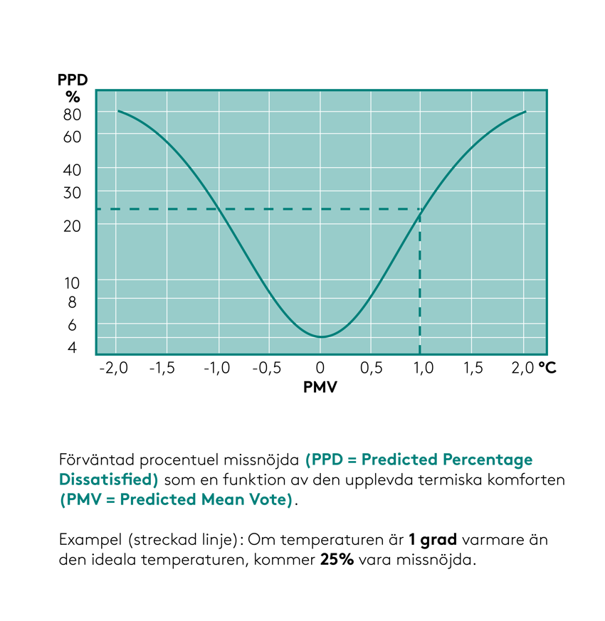 Fanger har forskat mycket på termisk komfort och tagit fram olika storheter som används för att kvantifiera den termiska komforten. Ett av dessa är PMV (predictive mean vote) som är en skala som går från -3 till +3 där 0 är neutralt och en negativ siffra anger att klimatet upplevs som kallare än optimalt och ju längre från 0 ju kallare upplevs klimatet. Omvänt antyder ett positivt värde att det är varmare än neutralläget. PMV-värdet beräknas utifrån ett antal olika parametrar så som operativ temperatur, aktivitetsnivå, klädesfaktor och lufthastigheter. Ett annat värde som Fanger introducerat är PPD (predicted percentage dissatisfied) d.v.s. ett mått som uppskattar hur stor andel av en population som skulle vara missnöjda med den termiska komforten. PMV och PPD-värden är korrelerade vilket ses i figur till vänster. När PMV värdena rör sig längre ifrån neutral läget kommer fler vara missnöjda med det termiska klimatet. Då vad som upplevs som ett bra termiskt klimat är individuellt kommer 0 på PMV skalan inte leda till 0% PPD. I stället kan man se att 0 PMV motsvarar ett PPD värde på 5%. Kort sagt - det går inte att få alla helt nöjda. 0 PMV kan också vara mycket svårt att uppnå och ”kosta mer än det smakar”. Det är därför viktigt att fundera över vad det finns för målsättning med det termiska klimatet när en byggnad med dess HVAC-system designas.