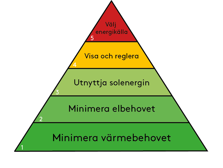För att välja inomhusklimatlösning så är det bra att börja med att utreda vilket behov man har av värme och kyla, detta kan man t.ex. göra med ESBO som är en simuleringsmjukvara. Då behovet är känt kan ett system med rätt storlek väljas. En bra hjälp för i vilken ordning olika insatser skall göras för att spara energi i en byggnad ges av Kyotopyramiden. Det mest energieffektiva sättet att kontrollera temperaturen är att konstruera byggnaden så att behovet av att värma eller kyla inte uppstår, detta är basen i Kyotopyramiden. Det kan handla om att isolera mer, välja bra glas, behovsstyra solavskärmning så att värme släpps in vintertid men kan hållas ute sommartid. Behovsanpassad solavskärmning kan också erhållas genom att takutsprång som skuggar sommartid när solen står högt men släpper in ljuset vintertid när solen står lägre. Genom att börja med att designa en byggnad med lågt behov av kyla och värme kommer det också bli enklare att få till en bra termisk komfort.
