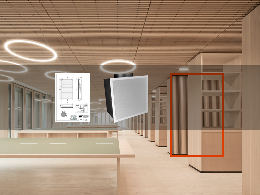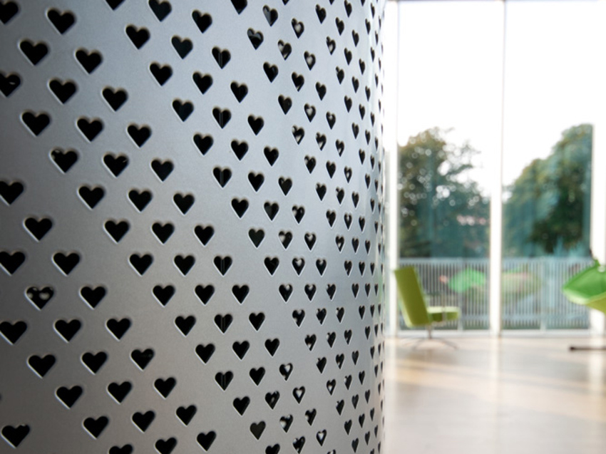 För exempelvis våra deplacerande luftdon erbjuder vi möjligheten till specialanpassad perforering. På bild till höger visas ett deplacerande luftdon med perforering i hjärtmönster.