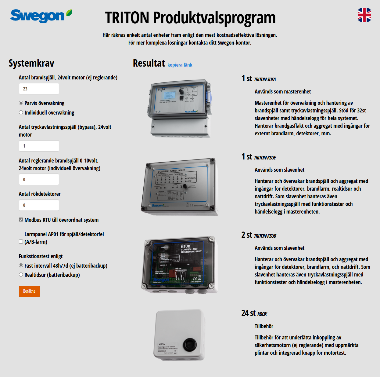 TRITON Produktvalsprogram ger ett kostnadseffektivt produktförslag på antal enheter för styr och övervakning av 24 V AC motoriserade brand- och tryckavlastningsspjäll med fjäderåtergång. Produktförslaget kan exempelvis vara en fristående enhet eller ett antal enheter i nätverk, med en masterenhet och flera tillhörande slavenheter.